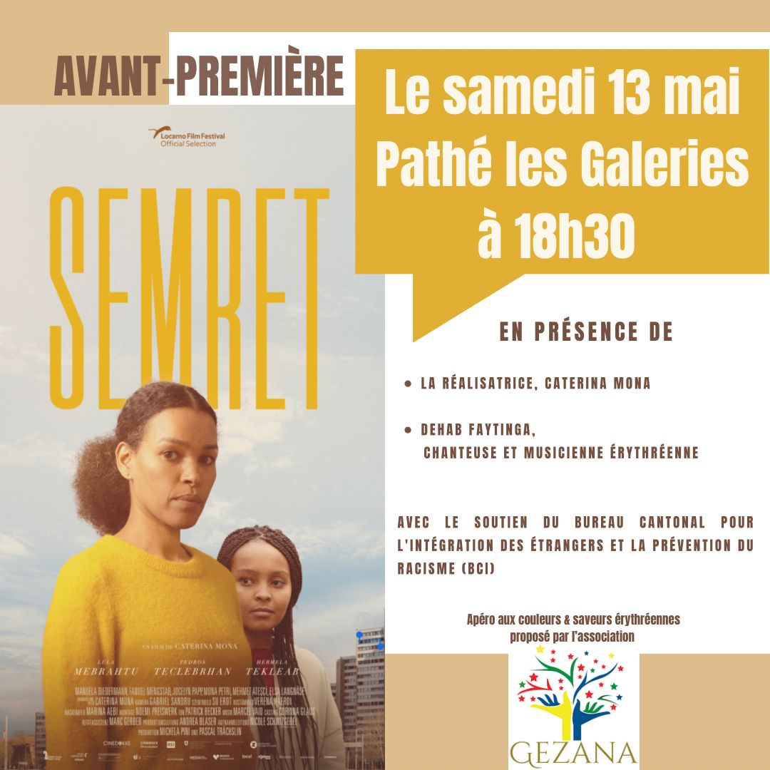 - 20h10 : discussion avec la réalisatrice, Madame Caterina Mona, la co-présidente de l’association Gezana, Madame Feven Afeworki et la déléguée à l’intégration du canton de Vaud, Madame Mina Benkais-Benbrahim (à confirmer)